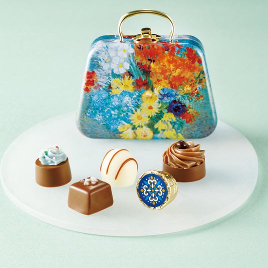 フィンセント・ファン・ゴッホの「ヒナギクとアネモネのある花瓶」が描かれた宝石箱のようなバッグ缶に、トリュフやガナッシュなど5種のチョコをアソート。