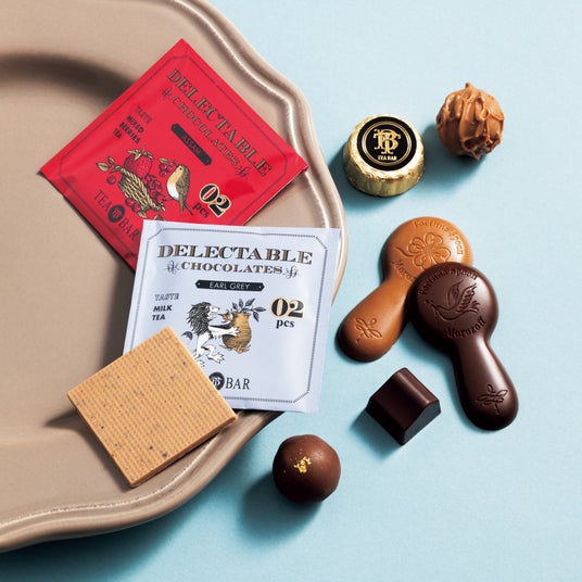 紅茶のガナッシュ入りミニトリュフや、ティーバッグ風チョコレートなどを詰め合わせました。紅茶を使ったチョコレートのバリエーションをひと箱で楽しめるアソートメント。