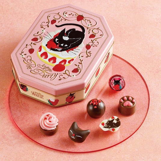 キュートな猫の人気シリーズ、今年のテーマは華やかなプレパーティー!ケーキを味わう黒猫のアンジュジュを描いた缶に、あまおういちご味のトリュフなどをイン。