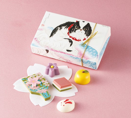 日本画家・高橋弘明の代表作「狆(ちん)」の絵の箱には、和菓子や羽子板の可憐な形に、抹茶、柚子、紫芋などの和の風味のチョコが。