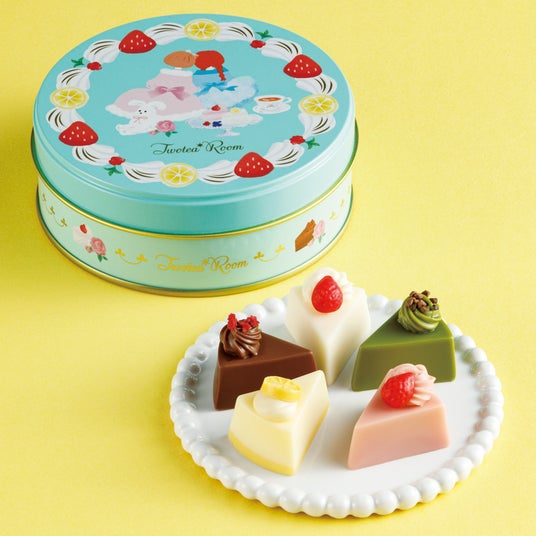 “ヌン活”を楽しむ女の子たちのアフターヌーンティーがコンセプト。イチゴやレモン、クリームで彩った丸缶に、5種のケーキを模したミニチュアチョコを詰め合わせて。