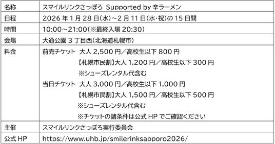 「笑う冬には、福来たる。」をキャッチフレーズに開催する「スマイルリンクさっぽろ Supported by辛ラーメン」は、札幌市の観光推進施策として、今年も開催されます。会場は前年に引き続き、大通公園3丁目西で、さっぽろ雪まつりの連携事業として実施されます。開催期間中、国内外からの観光客や市民の方に、札幌の新たな夜観光アクティビティとして、アイススケートをお楽しみいただけます。アクティオは、この「スマイルリンクさっぽろSupported by辛ラーメン」のスポンサーとして、本イベントを盛り上げていきますので、是非ご期待ください。