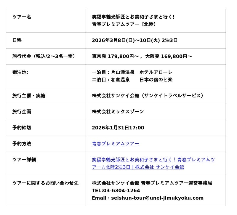 株式会社サンケイ会館(代表:箕輪 千明、本社:東京都千代田区)は、笑福亭鶴光師匠と田中美和子(お美和子さま)さまの連夜のトークショーイベントが目玉となる旅行ツアー「青春プレミアムツアー」の募集締め切りを1月末まで延長いたしました!本ツアーは2026年3月8日(日)から10日(火)までの2泊3日で、福井・金沢・能登を巡り、片山津温泉 ・和倉温泉に宿泊します。特に、日本三大朝市の一つである輪島の「出張朝市」を見学・応援する行程を組み込み、地域復興支援に貢献。参加者は越前ガニなど旬の海産物を堪能しながら、師匠やお美和子さまとの特別な「密室」イベントを通じて、非日常的な「昭和」の空間を存分に味わっていただきます。旅行代金は大阪発169,800円、東京発179,800円(いずれも税込)から。