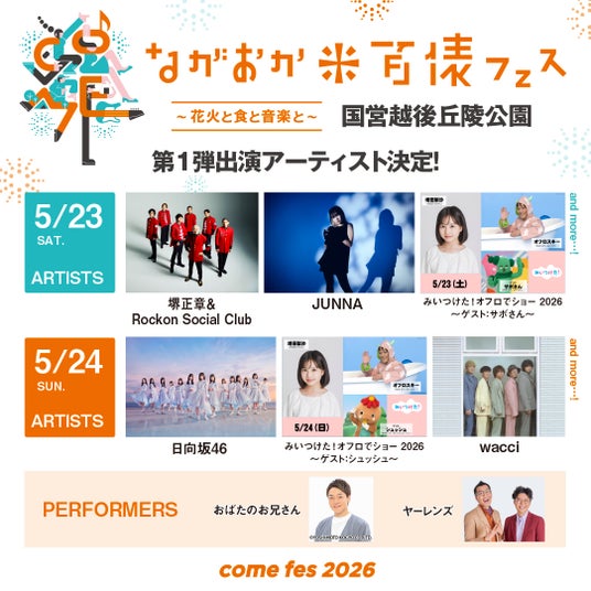 ながおか 米百俵フェス ~花火と食と音楽と~ 2026 第一弾出演アーティスト発表!堺正章&Rockon Social Clubや日向坂46、NHK Eテレステージなどが2日間を彩る