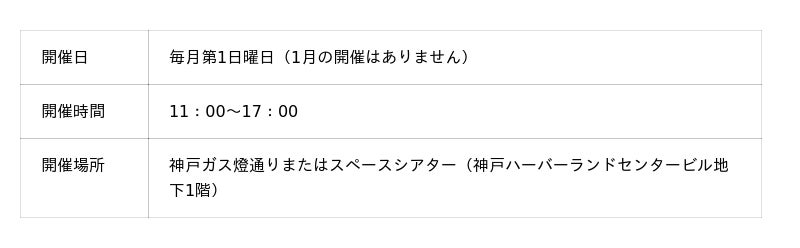 ハーバーマーケットは毎月第1日曜日に「神戸ガス燈通り」または「スペースシアター」で開催しています。開催場所については、月ごとに変更がございますので、ハーバーマーケットホームページをご確認のうえご来場ください。