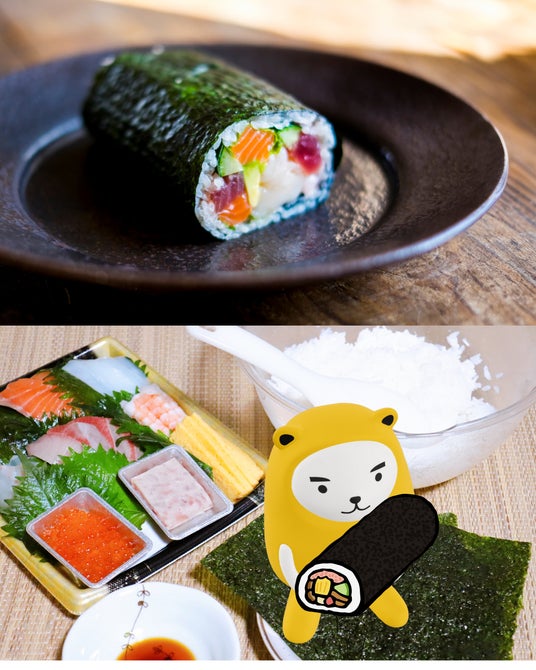 節分の食文化を象徴する恵方巻と、親しみやすいキャラクターを同一フレームに収めることで、日常の中の季節行事を楽しく切り取った一枚を表現しています。