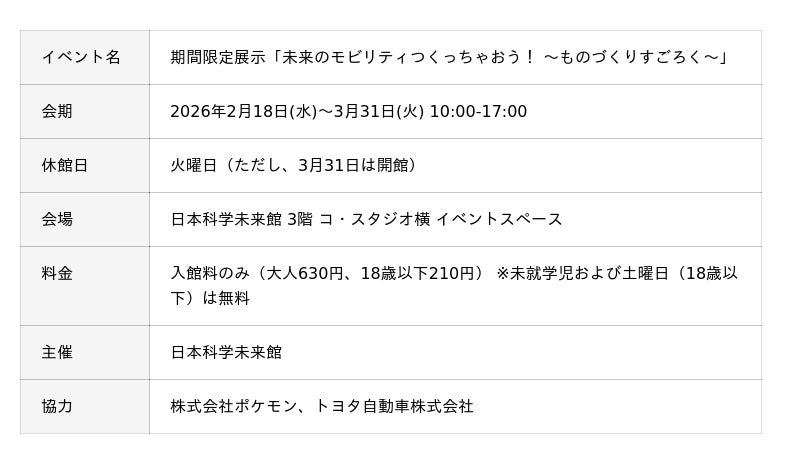 日本科学未来館(東京・お台場)は、期間限定展示「未来のモビリティつくっちゃおう! ~ものづくりすごろく~」を2026年2月18日(水)~3月31日(火)に開催します。未来のモビリティ(移動手段)をテーマに、自由な発想から実現に至るものづくりのプロセスを、すごろく形式の展示で表しました。仲間を募り、技術を集め、試行錯誤を繰り返すなど、完成までの過程を表現したマス目をたどりながら、夢が実現されていく様子を思い描くことができます。また、夢の実現の象徴として、ゲーム『ポケットモンスター』に登場するミライドンをものづくりのちからで具現化した「トヨタミライドン」を会場の中央に展示。会期中、実際に試乗できるイベントも開催します。