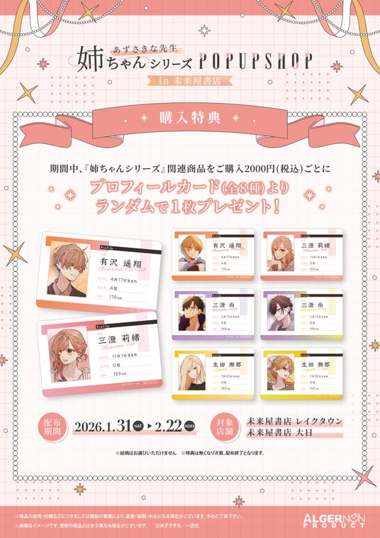 また、『姉ちゃんシリーズ』関連商品ご購入金額2,000円(税込)ごとに、本POP UP SHOP限定のプロフィールカード(全8種)よりランダムで1枚お渡しいたします。