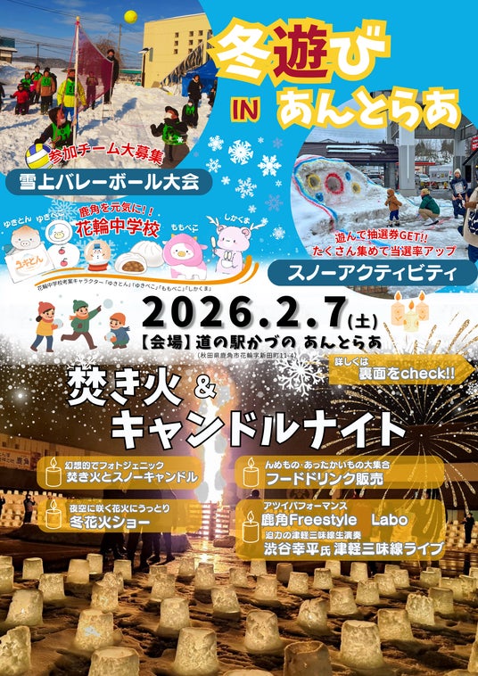秋田県鹿角市の地域DMOが運営する「道の駅かづの あんとらあ」にて、2026年2月7日(土)、冬の魅力を凝縮したイベント「冬遊び×焚き火&キャンドルナイト in 道の駅かづの あんとらあ」を開催いたします。