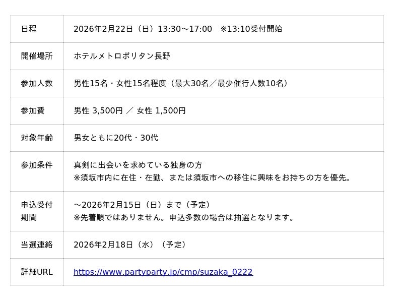 少子化や若年層の都市部流出による人口減少が進むなか、地域活性化には「定住」や「移住」につながる新たな人の流れの創出が求められています。IBJでは、婚活支援を通じて地域と人をつなぐ出会いの場を全国の自治体と連携して創出してきました。本イベントもその一環で、長野県須坂市と連携し、若者の地元定住や交流人口の拡大を目指す、須坂市コラボ企画の最終回となる恋活イベントです。