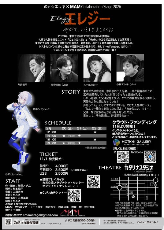 AI技術等のテクノロジーを活用したIP創出事業を展開する株式会社Pictoria(東京都港区、代表取締役CEO:明渡隼人、以下「Pictoria」)は、当社が開発・運営するAI VTuber「紡ネン Type-S」が、2026年2月20日(金)より上演される舞台「エレジー ~やがて、いとしきよこがお~」に出演することをお知らせします。
