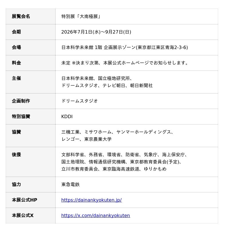 日本科学未来館(略称:未来館 館長:浅川智恵子)と、国立極地研究所、ドリームスタジオ、テレビ朝日、朝日新聞社は、特別展「大南極展」を2026年7月1日(水)~9月27日(日)に開催します。南極地域観測事業70周年を記念し、未知なる極限の大地、南極での観測活動と挑戦に迫る展覧会です。
