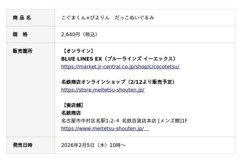 ジェイアール東海フードサービス株式会社(本社:愛知県名古屋市、代表取締役社長 岩下賢一)のオリジナルスイーツ「ぴよりん」と、名鉄グループ・名鉄NX運輸のキャラクター「こぐまくん」がついにコラボレーション!2026年2月5日(木)から、スイーツのセット商品とコラボぬいぐるみを販売します。