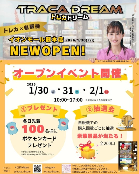 また、オープンを記念し、1月30日(金)~2月1日(日)の3日間限定でオープニングイベントを開催予定です。期間中は、各日先着100名様へのポケモンカードプレゼントおよび、自販機購入者限定の抽選会を実施いたします。