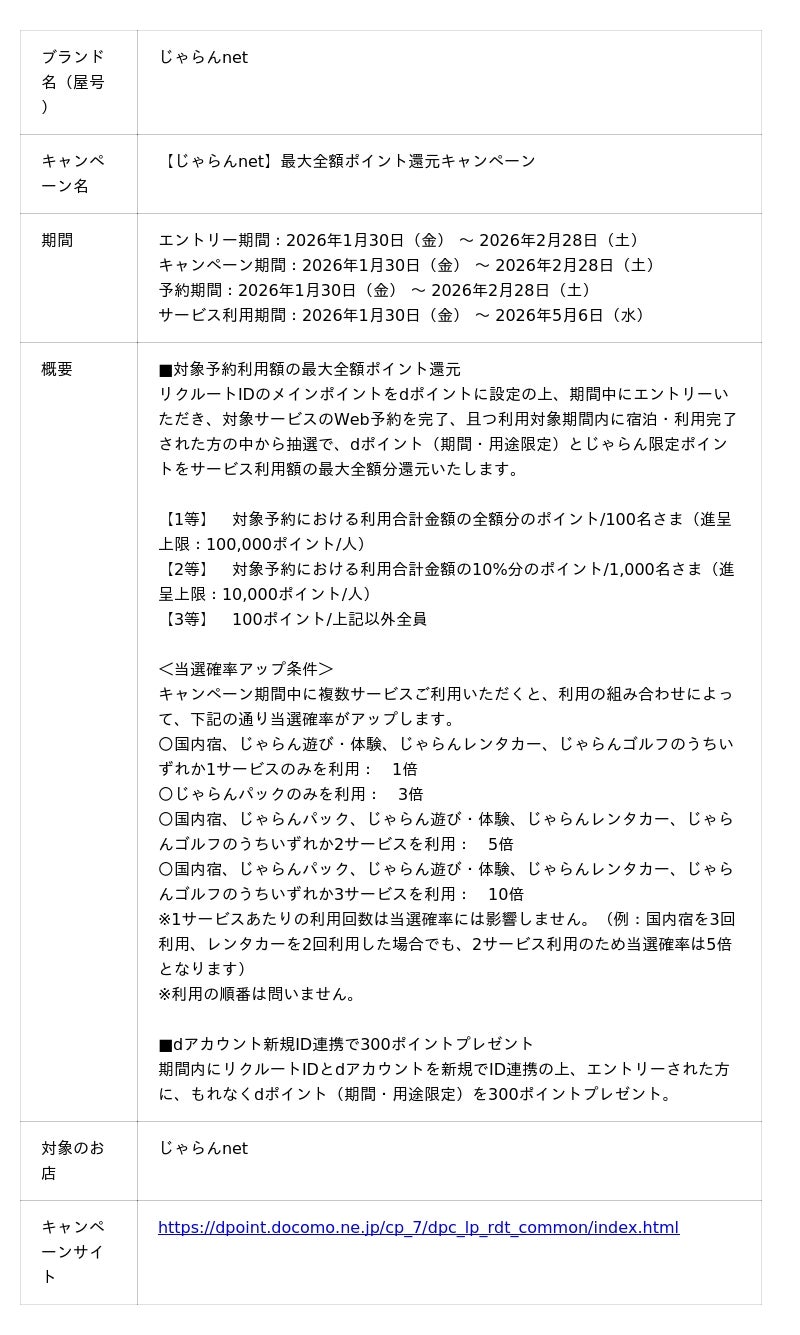 本キャンペーンの参加にはエントリー※1が必要で、じゃらんnetにおいて、リクルートIDのメインポイント※2をdポイントに設定の上、対象サービス※3のWeb予約を完了、且つ利用対象期間内に宿泊・利用完了※4された方※5の中から抽選で、サービス利用額※6の最大全額分※7のdポイント(期間・用途限定)※8とじゃらん限定ポイントを進呈いたします。さらに、期間中にリクルートIDとdアカウントを新規でID連携いただいた方に、もれなくdポイント(期間・用途限定)※8を300ポイント進呈いたします。キャンペーン詳細は、キャンペーンサイトにてご確認ください。