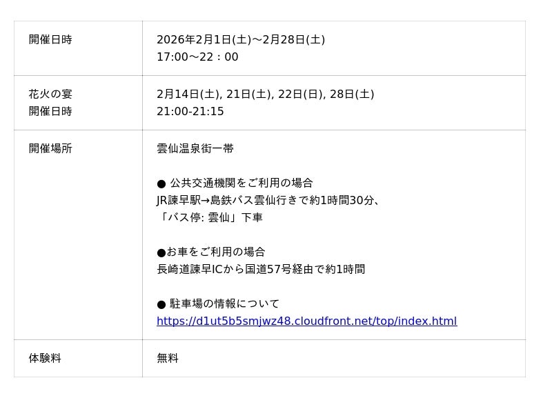 一般社団法人雲仙観光局 は、冬期恒例のイルミネーションイベント 「雲仙灯りの花ぼうろ2026」 を、2026年2月1日(日)~2月28日(土)までの期間、長崎県雲仙市・雲仙温泉街一帯で開催いたします。冬の澄んだ夜を背景に、湯けむりと光が織りなす幻想的な空間を演出し、地元住民・観光客に冬の雲仙ならではの夜の魅力をお届けします。