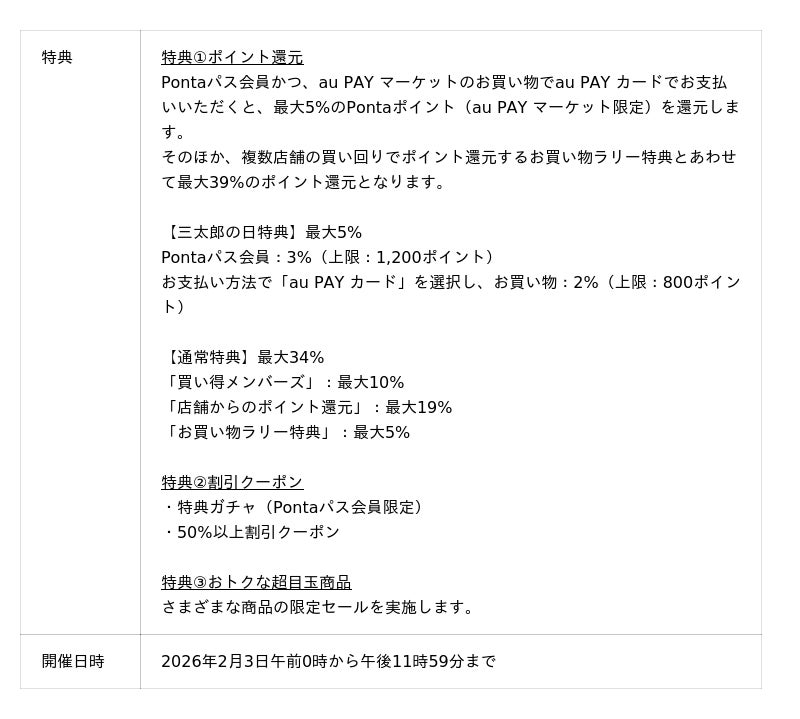 auコマース&ライフは、総合ショッピングサイト「au PAY マーケット」において、2026年2月3日から2月6日までの期間、三太郎の日およびお買い物ラリーを開催します。