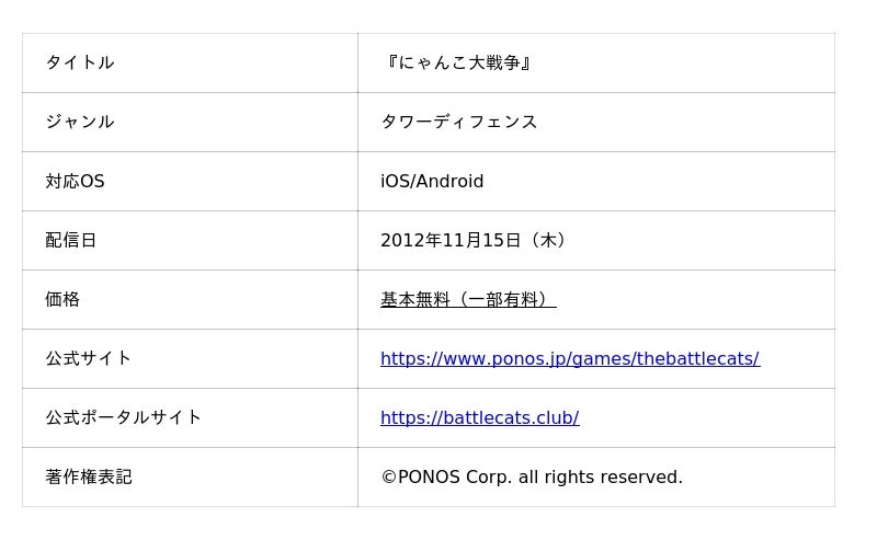 ポノスは、1990年の創業以来一貫してゲームを通してエンターテインメントという文化の発展に貢献してまいりました。【求められるモノは創らない、それ以上を創り出す。】を掲げ、求められるモノの中に、自分たちしか創れない価値をプラスしていくことを私たちは大切にしています。現在は、スマートデバイス向けのオリジナルゲーム開発を核に事業を展開し、代表タイトル『にゃんこ大戦争』は、累計DL数1億1000万回(2025年9月現在)を超え、多くのお客様に楽しんでいただいております。