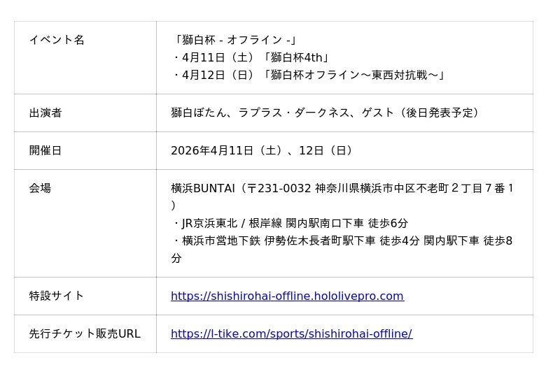 カバー株式会社(本社:東京都港区、代表取締役社長:谷郷元昭)とGLOE株式会社(本社:東京都新宿区、代表取締役社長:谷田優也、古澤明仁、東証グロース:9565、以下「GLOE」)は、ホロライブ所属の獅白ぼたん主催による「獅白杯」のオフラインイベントを共同で、2026年4月11日(土)、12日 (日)の二日間開催することをお知らせいたします。
