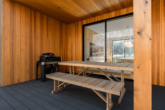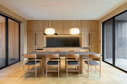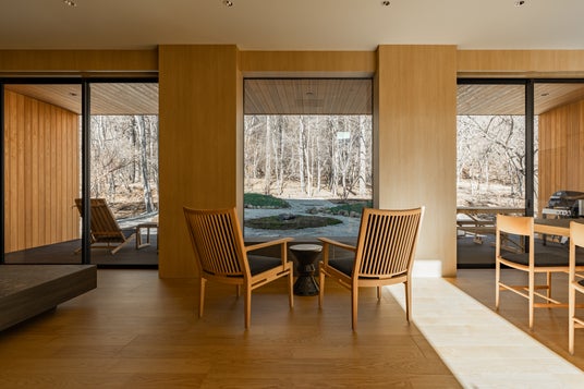 テラスを含めて50畳を超えるリビング・ダイニング・キッチンには、8名での団欒や食事を楽しむことができるソファやダイニングテーブル、造作キッチンを完備。ロゴのモチーフにもなった巨大な丸障子や黒と木目調で統一した家具が和モダンな印象を演出します。また、大開口の窓からは、四季を感じられる日本庭園とその奥へと続く森を一望することができます。