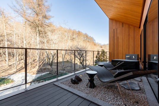 HOTEL SEION FUJIを象徴するバルコニー。横幅10m、最大天井高5mを誇り、サウナ・浴室から自然と一体化するようにデザインされた露天風呂付きの坪庭を完備。TIME & STYLEで統一したラグジュアリーな家具が、特別なひと時をより一層引き立てます。