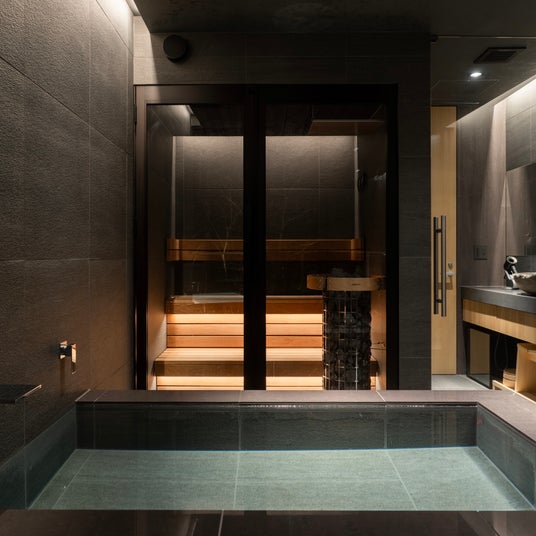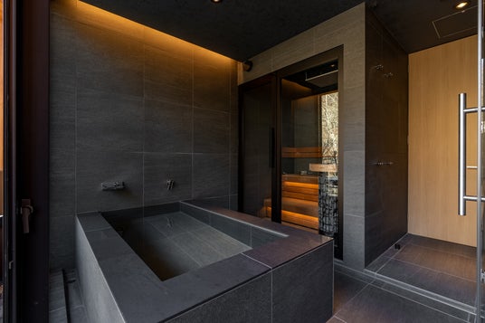 大きく開かれたガラス越しに四季を楽しめるサウナ。ストーブは、HARVIAのCILINDROを採用し、BLACKとNATURALのコントラストデザインで、落ち着いたひと時を過ごせます。隣接する浴室とバルコニーには、どちらでも水風呂として利用可能な内風呂と露天風呂を備え、充実のととのいを実現します。