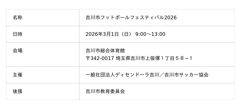一般社団法人ディセンドーラ吉川(埼玉県吉川市、代表理事:塩崎 巧巳)は、「吉川市フットボールフェスティバル2026」を3月1日(日)に開催することを決定いたしました。