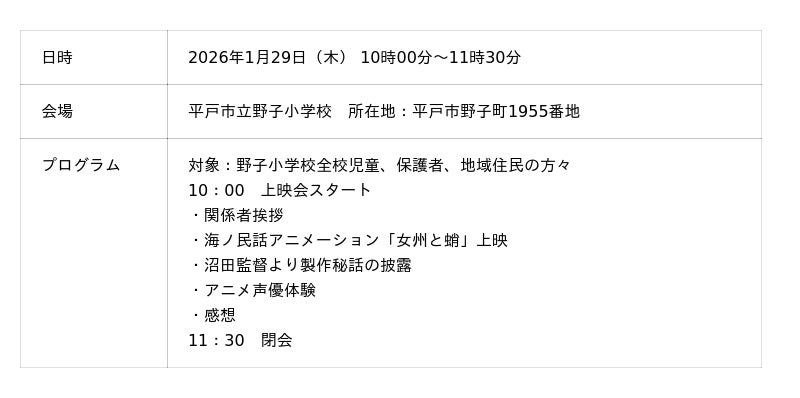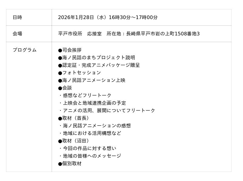 一般社団法人日本昔ばなし協会と日本財団が取り組む「海ノ民話のまちプロジェクト」は、2026年1月28日(水)に長崎県平戸市を舞台にした海ノ民話アニメーション「女州と蛸」が完成したため、アニメ監督が平戸市を訪問しアニメのお披露目と「海ノ民話のまち」認定式を実施しました。