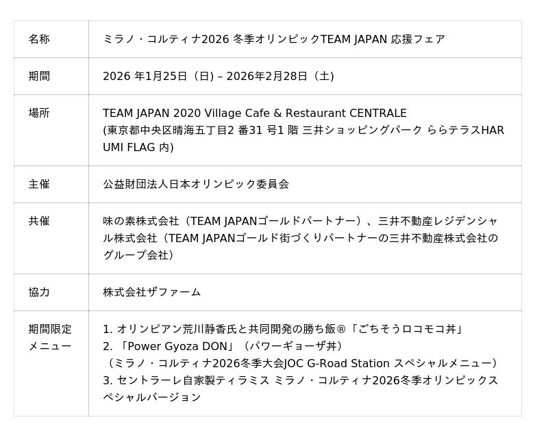 三井不動産レジデンシャル株式会社(本社:東京都中央区、代表取締役社長:嘉村徹)、公益財団法人日本オリンピック委員会(所在:東京都新宿区霞ヶ丘町4番2号、会長:橋本聖子、以下、「JOC」)、味の素株式会社(所在:東京都中央区、社長:中村茂雄、以下「味の素」)は共催で、「ミラノ・コルティナ2026冬季オリンピック TEAM JAPAN 応援フェア」を1月25日(日)~2月28日(土)まで開催しています。