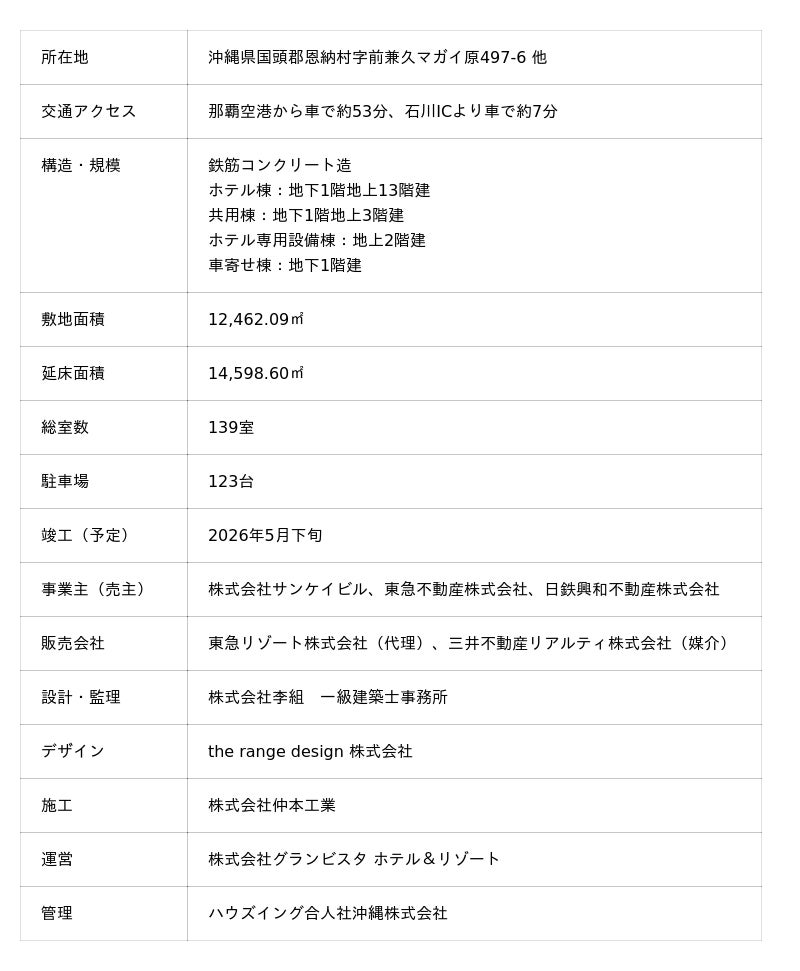 株式会社サンケイビル(本社:東京都千代田区、代表取締役社長:飯島 一暢)、東急不動産株式会社(本社:東京都渋谷区、代表取締役社長:星野 浩明)、日鉄興和不動産株式会社(本社:東京都港区、代表取締役社長:三輪 正浩)は、沖縄県国頭郡恩納村において開発を進めておりました「BLISSTIA(ブリスティア) SUITES & RESORT 沖縄恩納村」(以下、「本物件」という)につきまして、2026年2月6日(金)より一般販売を開始いたしますので、お知らせいたします。