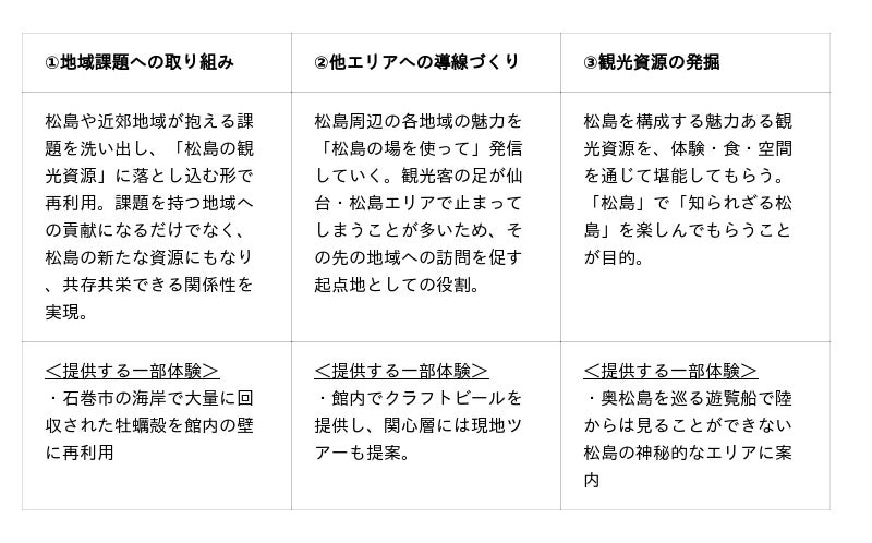 「地域の価値で、未来を変えていく。」という当社のブランドステートメントのもと、「YOKI MATSUSHIMA」では、“ローカルフォーカス(地域連携)”をキーワードに、地元食材や伝統工芸、地域の生産者・作り手との協働を深めながら、松島と東北各地を結ぶ拠点地となる取り組みを順次展開してまいります。