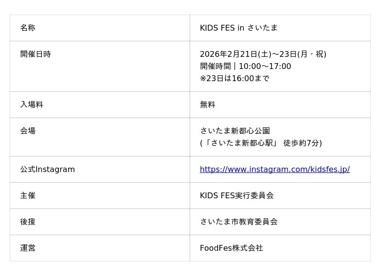 FoodFes株式会社(代表取締役:稲垣一馬)は、2026年2月21日(土)から23日(月・祝)までの3日間、さいたま新都心公園(埼玉県さいたま市)にて、子ども向け体験型イベント「KIDS FES in さいたま」を開催いたします。