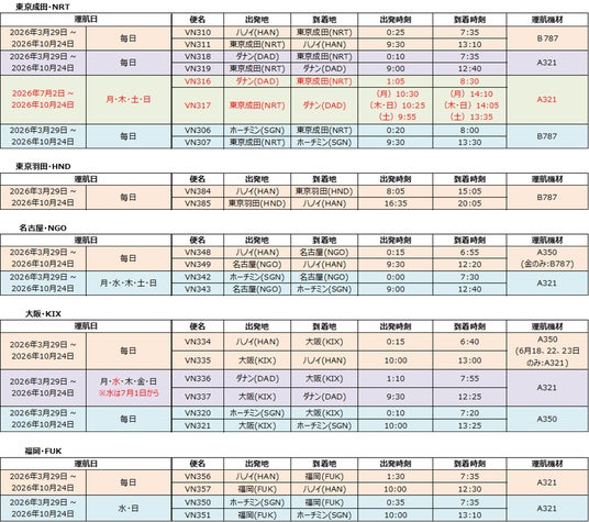 ベトナム航空(日本支社 所在地:東京都千代田区、総支配人:ゴー・シー・アイン)は、2026年3月29日(日)から2026年10月24日(土)までの夏季運航スケジュールを発表しました。