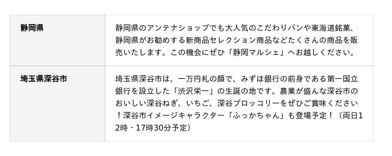 2026年2月は17日(火)・18日(水)に、静岡県・埼玉県(深谷市)の名産品が出展されますので、お知らせします。