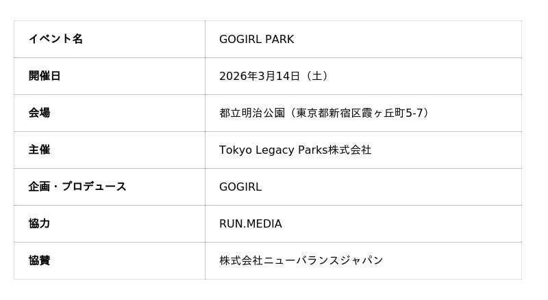 東京建物株式会社(以下「東京建物」)を代表構成団体とし、三井物産株式会社、日本工営都市空間株式会社、西武造園株式会社、株式会社読売広告社、株式会社日テレ アックスオンを構成員とするコンソーシアムが設立したTokyo Legacy Parks株式会社(以下「TLP」)は、ランニングコミュニティ「Runner’s Park Tokyo」のイベントとして、女性ランニングコミュニティ「GOGIRL」がプロデュースする体験型ランニングイベント「GOGIRL PARK」を、2026年3月14日(土)に都立明治公園にて共同開催いたします。