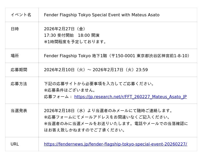 Fender Flagship Tokyoは、世界的ギタリスト、マテウス・アサトを迎えたストアイベント 『Fender Flagship Tokyo Special Event with Mateus Asato』 を、2026年2月27日(金) に開催することが決定しました。本イベントの観覧応募は、2026年2月10日(火)よりFenderNewsのイベントサイトにて開始します。