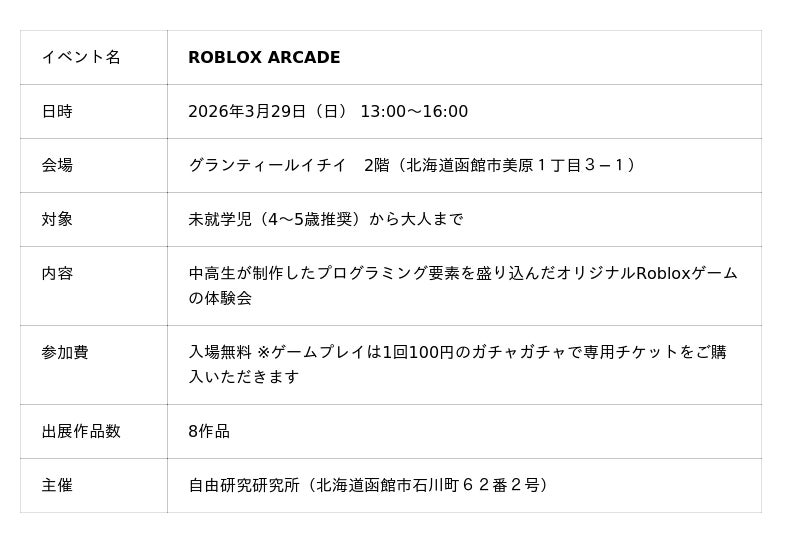 10代向けデジタル人材育成サービス『TechHigher』を運営する株式会社エクシード(本社:東京都渋谷区、代表取締役:澤部愛子)は、ライセンス提携校である 函館市で最大規模の生徒数を誇るプログラミング教室「自由研究研究所(所長:三上裕司)」が、2026年3月29日(日)、中高生8名が自ら制作したRoblox(ロブロックス)のオリジナルゲームを、来場者がアーケード形式で体験できるイベント「ROBLOX ARCADE」を函館市美原の複合商業施設「グランティールイチイ」にて開催することをお知らせいたします。