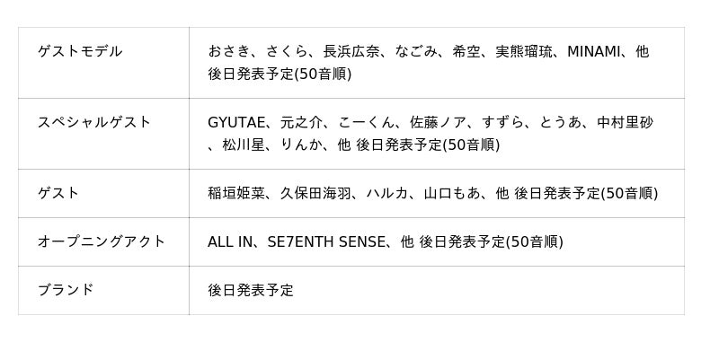 スペシャルゲストとして、ガールズバンド「suga/es(シュガレス)」のボーカルを務めながらモデル・クリエイターとしても幅広く活躍する佐藤ノア、2次元さながらのベビーフェイスと抜群のスタイルで人気を集める北海道出身のコスプレイヤー・すずら、数々のファッション誌で人気モデルとして活躍し、近年はタレント・俳優としての活動やアイドルグループのプロデュースなど多方面で存在感を放つ中村里砂、ファッション誌『JJ』で専属モデルを務め、SNS総フォロワー数137万人超を誇る俳優・モデルの松川星の4名の出演が決定しました。