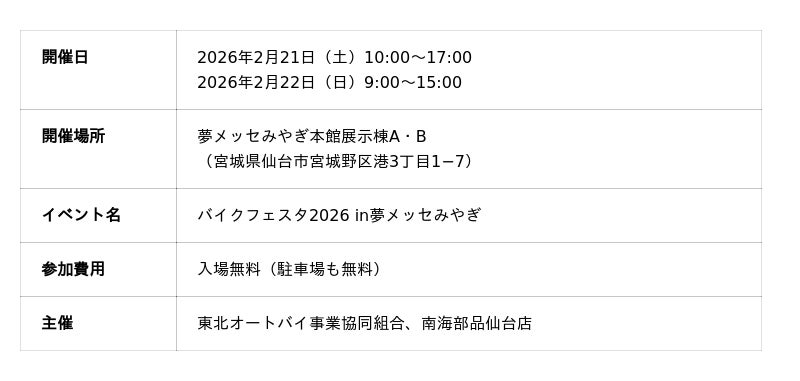 JAF(一般社団法人日本自動車連盟)宮城支部(支部長 梅津 行雄)は、2月21日(土)~2月22日(日)の2日間、夢メッセみやぎ(宮城県仙台市宮城野区港3丁目1-7)で開催される「バイクフェスタ2026」にJAFブースを出展します。