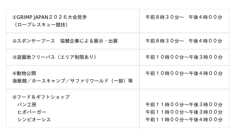 アドベンチャーワールド(和歌山県白浜町)は、2026年3月18日(水)にGRIMPJAPAN2026実行委員会主催のもと開催される日本最大規模のロープレスキュー国際競技会「GRIMP JAPAN 2026」に協力いたします。本大会は、国内外から集結した救助のスペシャリストたちがパーク内の広大なフィールドを舞台に、高度な救助技術を競い合うものです。当日は休園日のパークを特別に開放し、競技観戦に加え、一部の動物公開(エリア制限あり)や遊園地アトラクション、フード・ギフトショップ(一部営業)など1日限定の特別な体験を提供します。