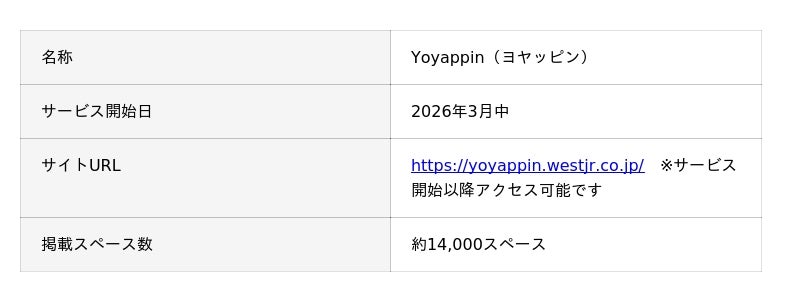 日本全国に多数展開している「STATION WORK」と「テレキューブ」を掲載予定。これにより「Yoyappin(ヨヤッピン)」では、出張時や外出先でのリモートワークというビジネスパーソンの利用需要に対応します。また、JR西日本という特色を活かし、鉄道関連として廃線当時のままの姿で保存している「邑南町三江線鉄道公園 口羽駅公園(旧JR三江線口羽駅) 」や、万博で好評を博し現在も人気継続中の「Dothealthカラダ測定サービス」の予約開始も予定しています。