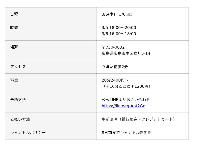 占い師養成CAMPの説明会と同時に、くるとん先生の対面鑑定も広島で行います。すでにご予約いただきました方、誠にありがとうございます。くるとん先生が広島で鑑定される貴重な機会になりますので、奮ってご参加ください。