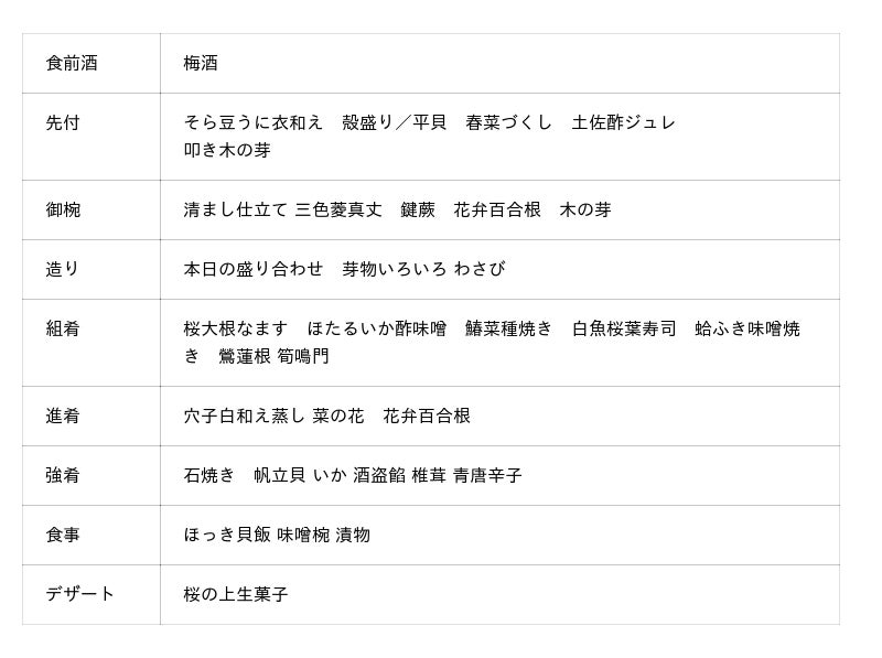 季節感に溢れ、見た目も美しい旬の食材を使った料理が楽しめる全7品の特撰昼会席をご用意いたします。前菜は三色菱寄せをはじめ、鯛手鞠寿司など季節を感じる彩り豊かな品々を揃えました。焼物では、卵黄のコクと和がらしの切れ味を利かせ、刻んだ菜種を合わせた特製ソースとともに焼いた鰆と、焼くことでほくほくとした食感が楽しめる焼きそら豆をご堪能ください。進肴には蕨と豆腐を油揚げで包み、ふっくらと仕上げた信田巻に旬の筍やわかめを添え、出汁香る餡で優しく仕立てました。締めくくりのデザートは、桜の花びらをあしらった桜の羊羹をご用意いたします。淡い色合いと上品な甘さが会席の余韻を静かに引き立てます。