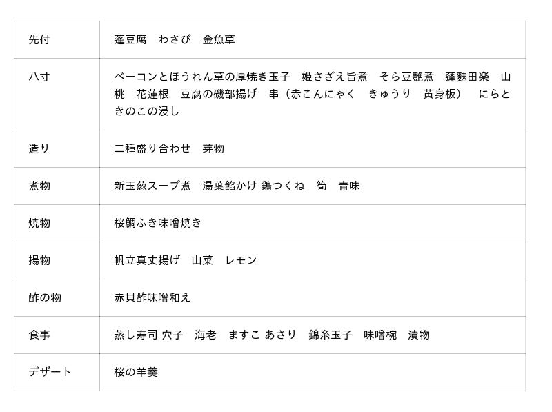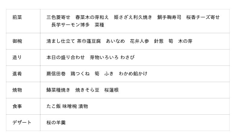 【組肴】 桜大根なます ほたるいか酢味噌 蛤ふき味噌焼き 白魚桜葉寿司 鰆菜種焼き 筍鳴門 鶯蓮根