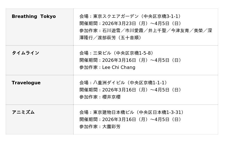 会場:1.東京スクエアガーデン 1階エントランス(中央区京橋3-1-1)2.東京建物日本橋ビル 1階エントランス(中央区日本橋1-3-31)