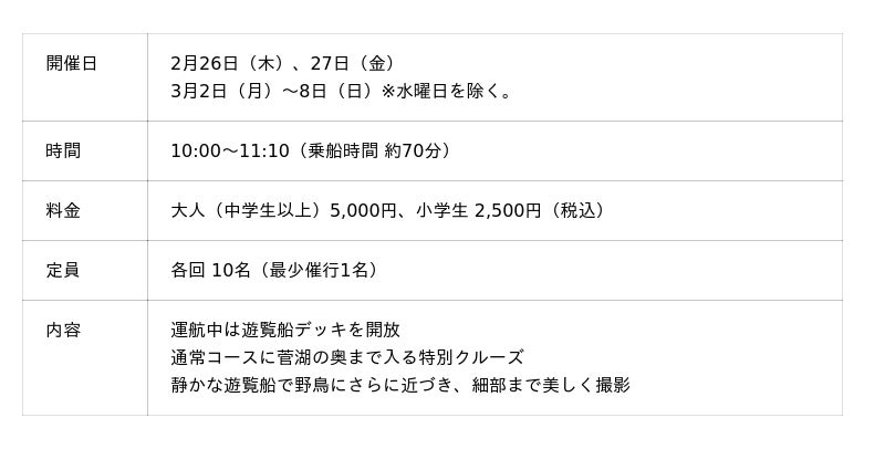 遊覧船デッキに出て、普段とは違う視点・ロケーションで撮影できる「フォトクルーズ」を開催します。湖面に映る山々や、冬の三方五湖に飛来する野鳥たちを撮影できます。