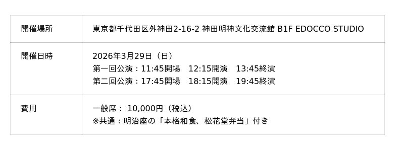 一般社団法人千代田中央文化交流推進機構(東京都千代田区)は、「日本橋座設立プロジェクト企画」Vol1としてイベントを2026年3月29日に開催いたします。