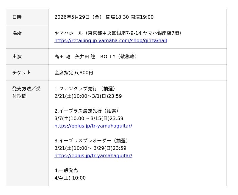 その高田漣氏とともに、広い世代に支持されるゲストミュージシャンとして矢井田 瞳氏とROLLY氏を迎え、それぞれのソロ演奏にセッションも交えながらアコースティックギターを披露し、ギターとの出会いや音楽への想いについて大いに語るライブを、アコースティック楽器に最適な音響設計が施されたヤマハホールで開催します。音楽専用のヤマハホールならではの豊かな「響き」を体感いただくとともに、2026年で60周年を迎えるヤマハギターの魅力を存分にご堪能ください。