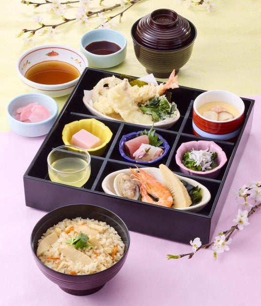 店仕込みの「筍ごはん」、「真鯛」のお刺身、「桜豆腐」、「釜揚げしらす」と、春の食材を使用した天ぷらなどを盛り合わせた和膳です。少しずつ春の味覚をぜいたくに楽しめる季節メニューです。