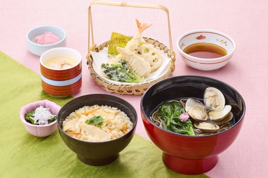 「筍ごはん」に、筍の天ぷらとふっくらとしたはまぐりをのせたそばを組み合わせた御膳です。